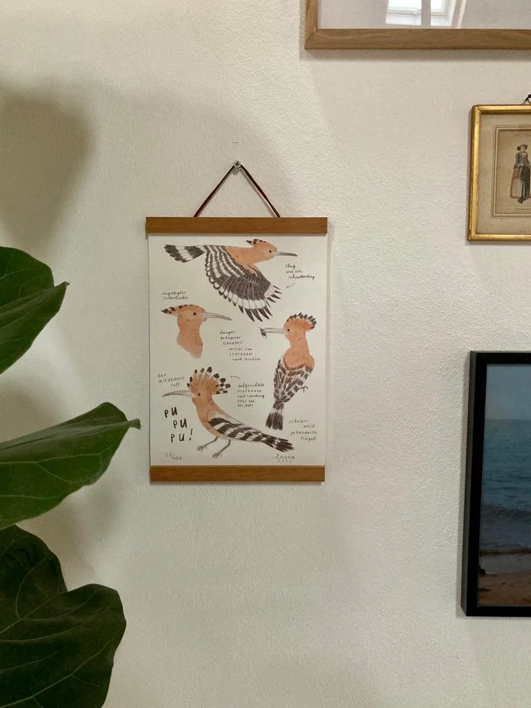 Im Stile historischer Lehrtafeln informiert unser Kunstruck nicht nur über die wichtigsten Verhaltensweisen des Wiedehopfes, sondern zeigt ihn auch in unterschiedlichen Perspektiven mit all seinen Merkmalen und Eigenschaften. Die Illustratorin Lucia Zamolo, aus deren Feder auch das unverkennbare Design auf unseren Bierflaschen stammt, zeichnet auch hier den Wiedehopf so, wie wir ihn bereits von ihr kennen und lieben: als sympathischen, aufgeweckten Kerl, den es zu schützen gilt!